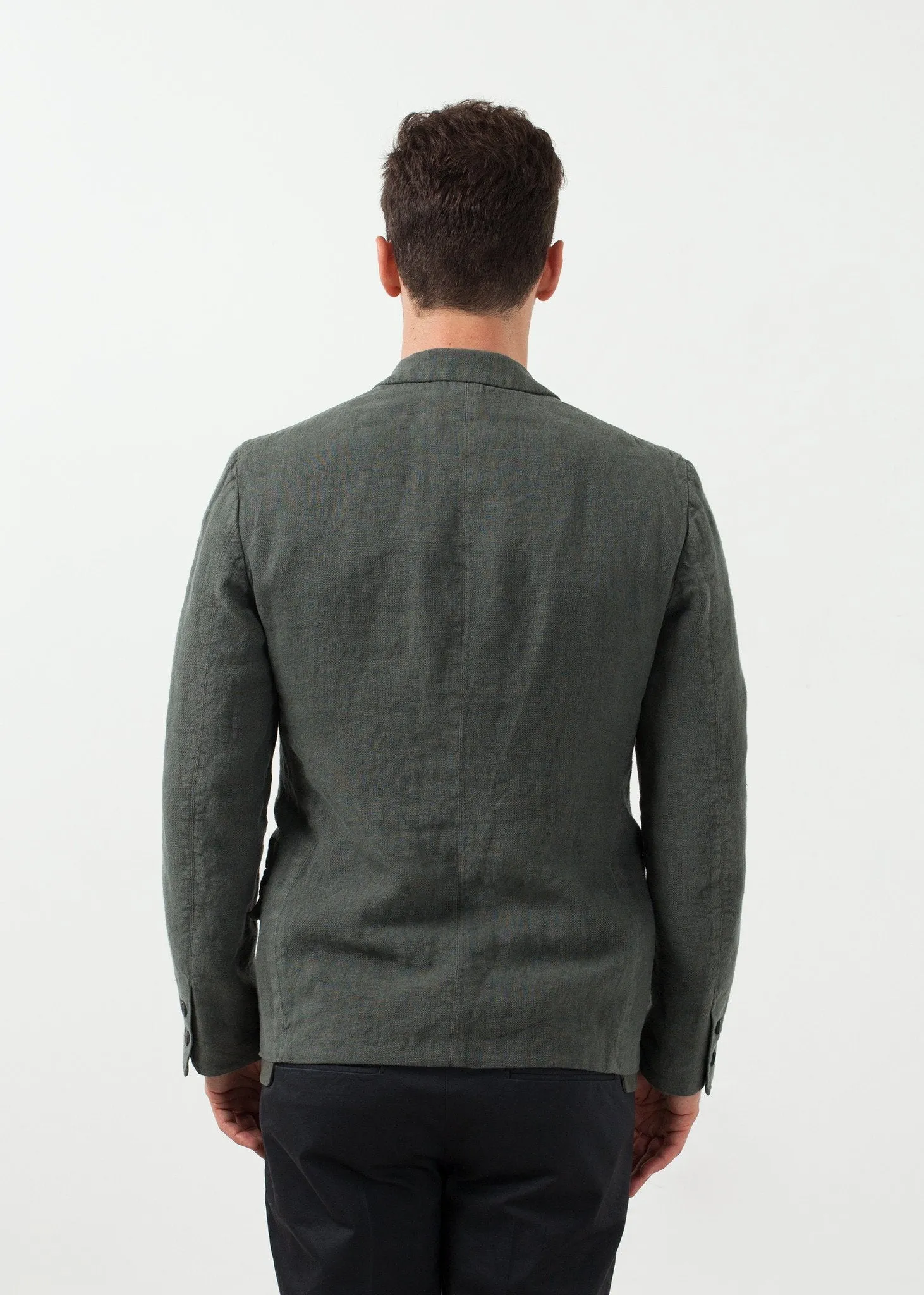 The Five Button Blazer is elegant, yet casual. Industrially strong fabrics combine in a classic silhouette makes a refined look. Button placket closure at center front. Three exterior pockets at front, two interior pockets. Lardini. Color Green. 100% Flax, Jacket Lining 100% Cotton, 60% Acetate, 40% Cotton. Made in Italy. Jacob is wearing a 50.
